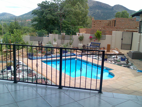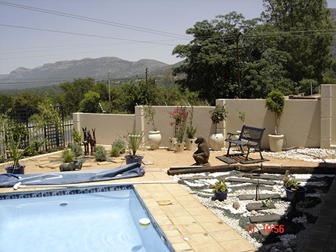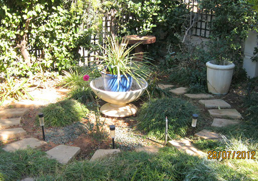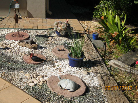 The photos in the following slideshow were taken when we were setting up the garden.The first is the most interesting as you can see the soil conditions in the background behind the pool. The ground is composed of small boulders and clay and you can clearly see the slope of the ground.