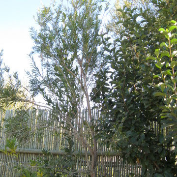 We had a long box built on the boundary next to the road and in this we imported good quality soil. We then put up the wooden lattices so that the plants that we were putting in were given some form of support. In the box we planted melalucas, climbing roses, bouganvilleas, hibiscus, viburnum and bottle brush plants which are fairly quick growers.