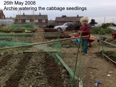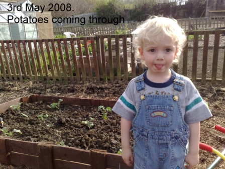 (Click arrows for photo 5) By the 3rd of May they had planted potatoes. They cheated a little and bought some plants from a nursery - they got sprouts, pumpkins and broccoli - which is Archie's favourite.