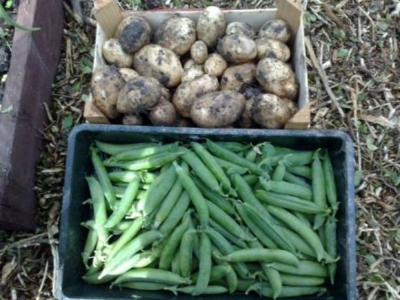 (Click arrows for photo 12 & 13) By the beginning of July their first crops were ready. So Archie's mum made a Sunday lunch and Archie and daddy brought home the first produce from the allotment. Archie was very excited.