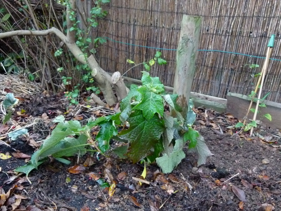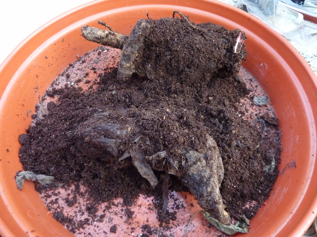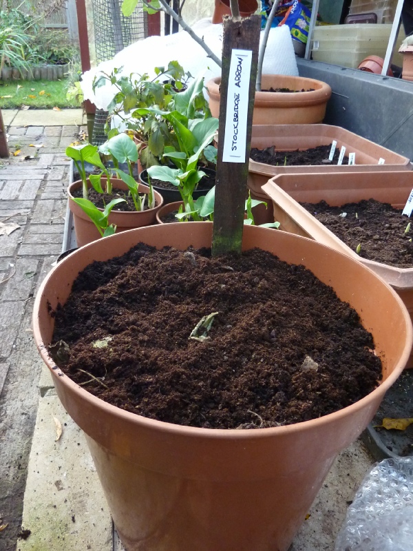 Supplied by Thompson & Morgan. Two roots planted in large pot to be kept in greenhouse through worst of winter weather. |